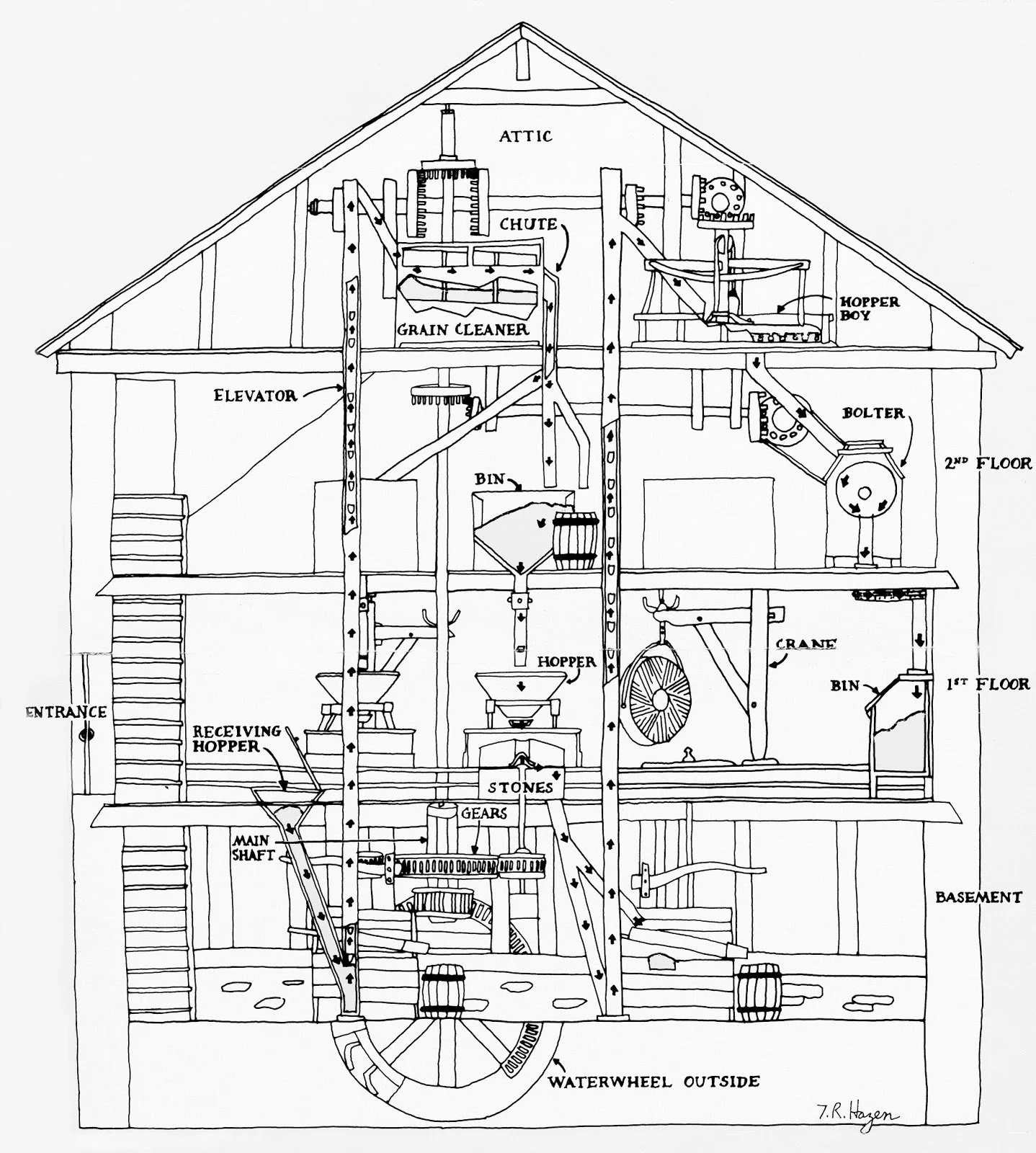 A cross-section showing the Oliver Evans grain processing system at Peirce Mill in Washington DC. Completely powered by the revolving mill wheel, the system cleans and funnels grain to the millstones, then cools and sifts the resulting flour.